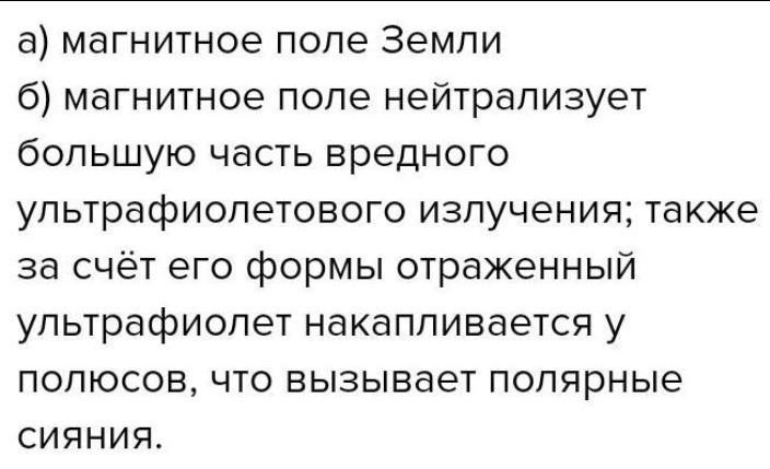 - б) магнитное поле неитрализует большую часть вредного ультрафиолетового излучения, также за счет его формы отражённый ультрафиолет котором накапливается у полюсов что вызывает полярное сияние