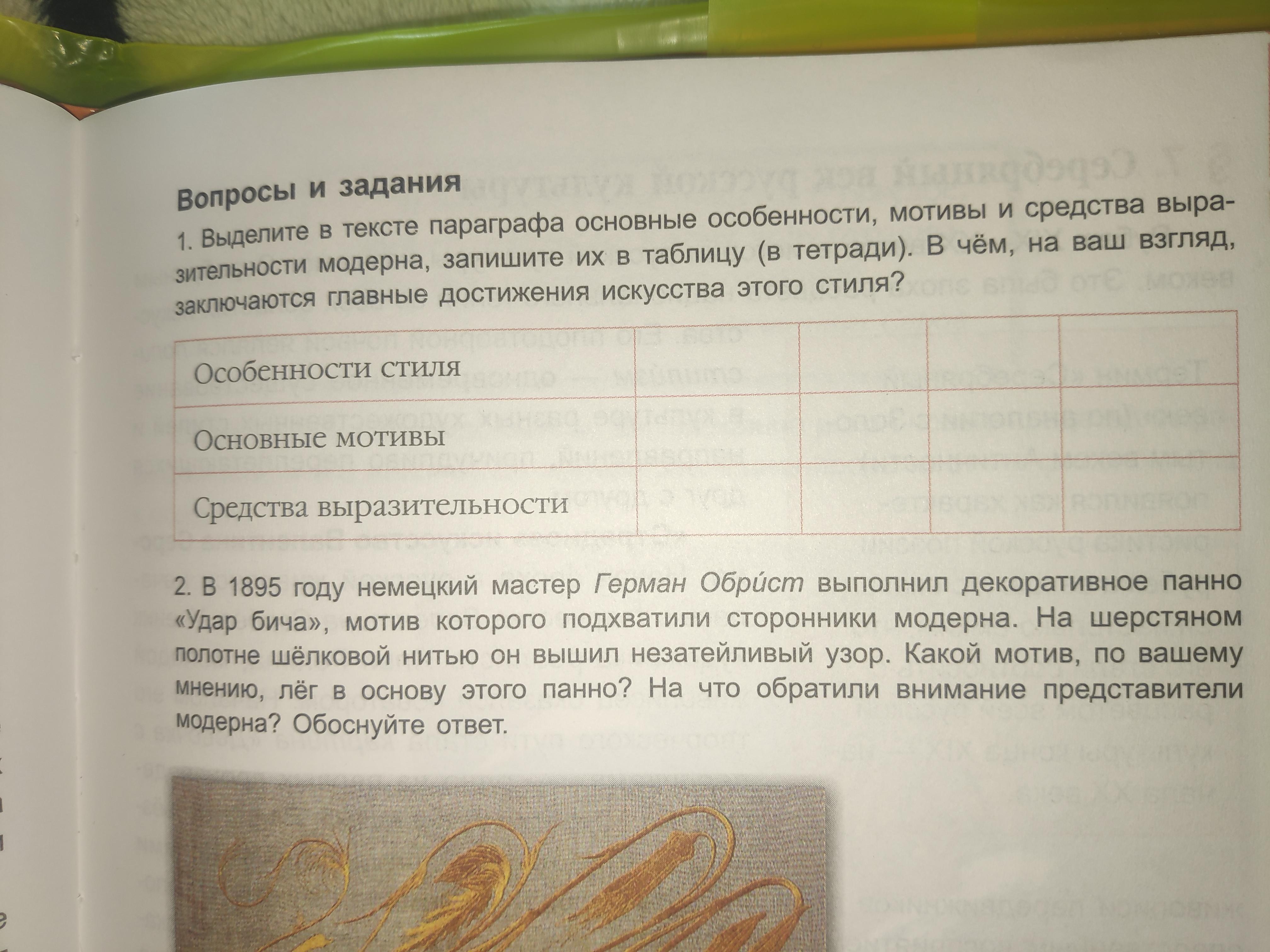 Выделите в тексте параграфа основные особенности, мотивы и средства выразительности модерна, запишите их в таблицу (в тетради). В чём, на ваш взгляд. заключаются главные достижения искусства этого стиля?