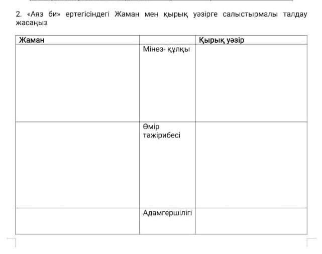 2. «Аяз би» ертегісіндегі Жаман мен қырық уәзірге салыстырмалы талдау жасаңыз Жаман Мiнез-құлқы Өмiр тажiрибесi Адамгершiлiгi Қырық уәзір
