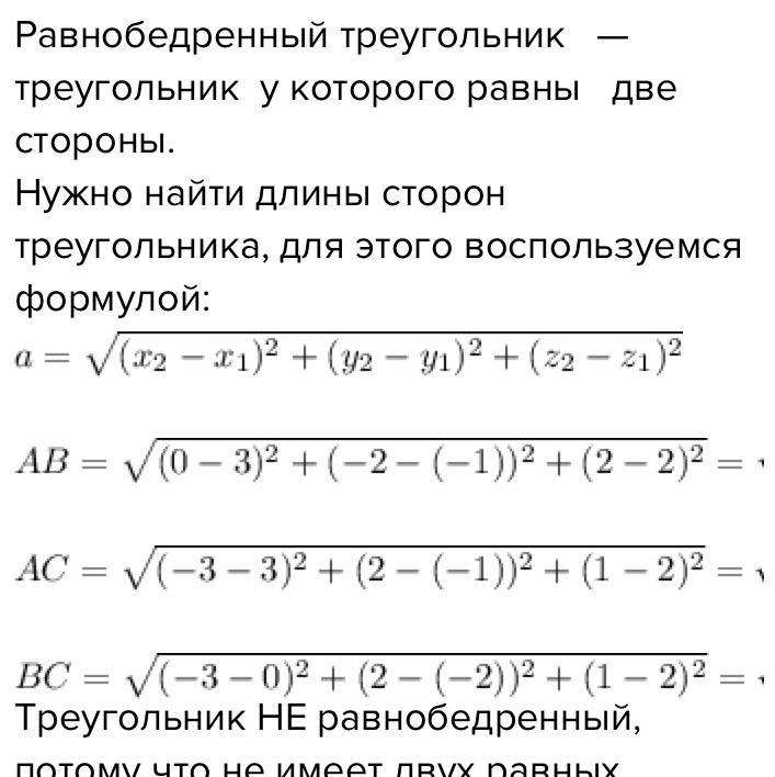 в конце: Треугольник НЕ равнобедренный, потому что не имеет двух равных сторон.
