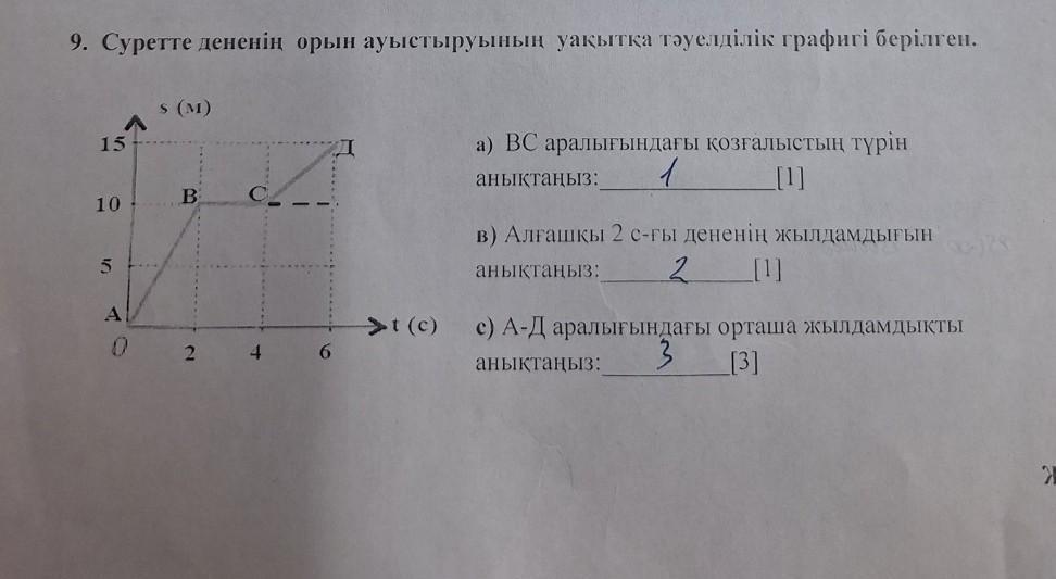 9. Суретте дененiн орын ауыстыруынын уакытка тәуелділік графигі берілген. s (M) 15 10 5 А B 2 4 6 >t (c) a) BC аралыгындагы козгалыстың түрін 1 [1] аныктаныз: в) Алгашкы 2 с-гы дененiн жылдамдыгын 2 [1] аныктаныз: с) А-Д аралыгындагы орташа жылдамдыкты 3 аныктаныз: [3]