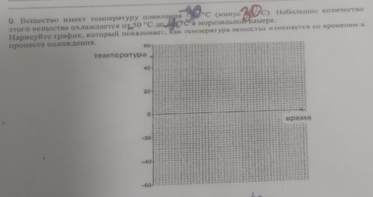 9. Вещество имеет температуру плавлення -30°С. небольшое количество этого вещества охлаждается от -50 °С до -40 °С "с в морозильной камере. Нарисуйте трафик, который показывает, как температура вещества изменистри со временем в процессе охлаждения.