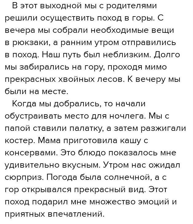 Осы демалыста ата-анам екеуміз тауға серуендеуді шештік. Кешке рюкзактарымызға қажетті заттарды жинап, таңертең ерте серуенге шықтық. Біздің сапарымыз қысқа болған жоқ. Әдемі қылқан жапырақты ормандардан өтіп, тауға ұзақ шықтық. Кешке біз сонда болдық.