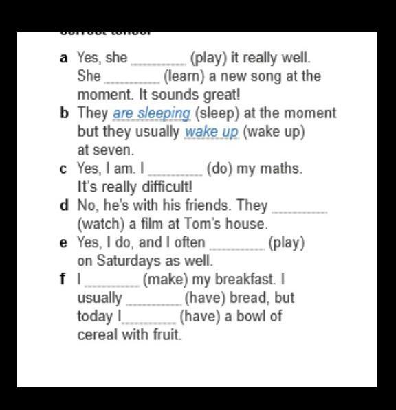 a Yes, she She (play) it really well. (learn) a new song at the moment. It sounds great! b They are sleeping (sleep) at the moment but they usually wake up (wake up) at seven. Yes, I am. I (do) my maths. It's really difficult! d No, he's with his friends. They (watch) a film at Tom's house. e Yes, I do, and I often c on Saturdays as well. fl (play) (make) my breakfast. I (have) bread, but (have) a bowl of usually today I cereal with fruit.
