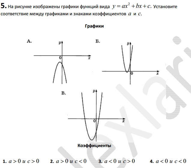 А-4 ветви параболы вниз, значит, а<0, точка пересечения с осью оу меньше нуля, значит c<0