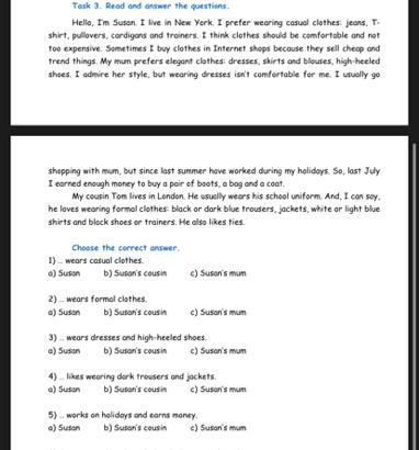 4: там писалось что кузен носит темную формальную одежду: брюки, пиджаки, рубашки и тд, так что там правильный вариант В)