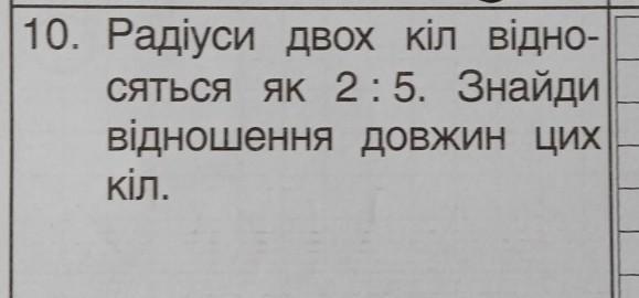 Відношення радіусів кіл - 2:5. Щоб знайти відношення довжин цих кіл, ми можемо використовувати формулу: відношення довжин = 2πr₁ : 2πr₂, де r₁ і r₂ - радіуси кіл. Після спрощення отримуємо: відношення довжин = r₁ : r₂ = 2/5.