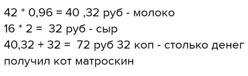 Кіт Матроскін продав 42 л молока по 96 коп.за літр і 16 кг сиру по 2 грн за кілограм.Скільки грошей отримав Матроскін за свій товар?