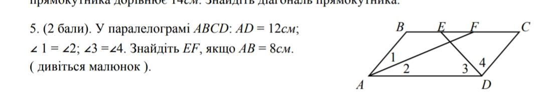 АЕ і FD - бісектриси. Бісектриса паралелограма відсікає від нього рівнобедрений трикутник. ΔАВЕ - рівнобедрений, ВЕ=АВ=8 см; ΔFCD - рівнобедрений; СD=АВ=8 см, СF=8 cм. ВС=AD=12 cм. EF=12-8-8=-4; EF=4 cм.