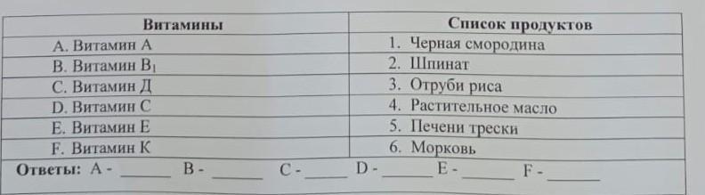 15. Составьте список продуктов со значительным содержание витаминов. используя таблицу и предложенные ниже слова. Впишите названия продуктов в пустые строчки Витамины А. Витамин А В. Витамин В С. Витамин Д D. Витамин С Е. Витамин Е F. Витамин к Ответы: А - B- С- D- Список продуктов 1. Черная смородина 2. Шпинат 3. Отруби риса 4. Растительное масло 5. Печени трески 6. Морковь E- F- [2]