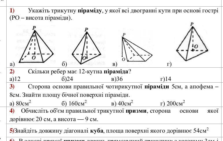 СРОЧНО 1) Укажіть трикутну піраміду, у якої всі двогранні кути при основі гострі (РО-висота піраміди). a)