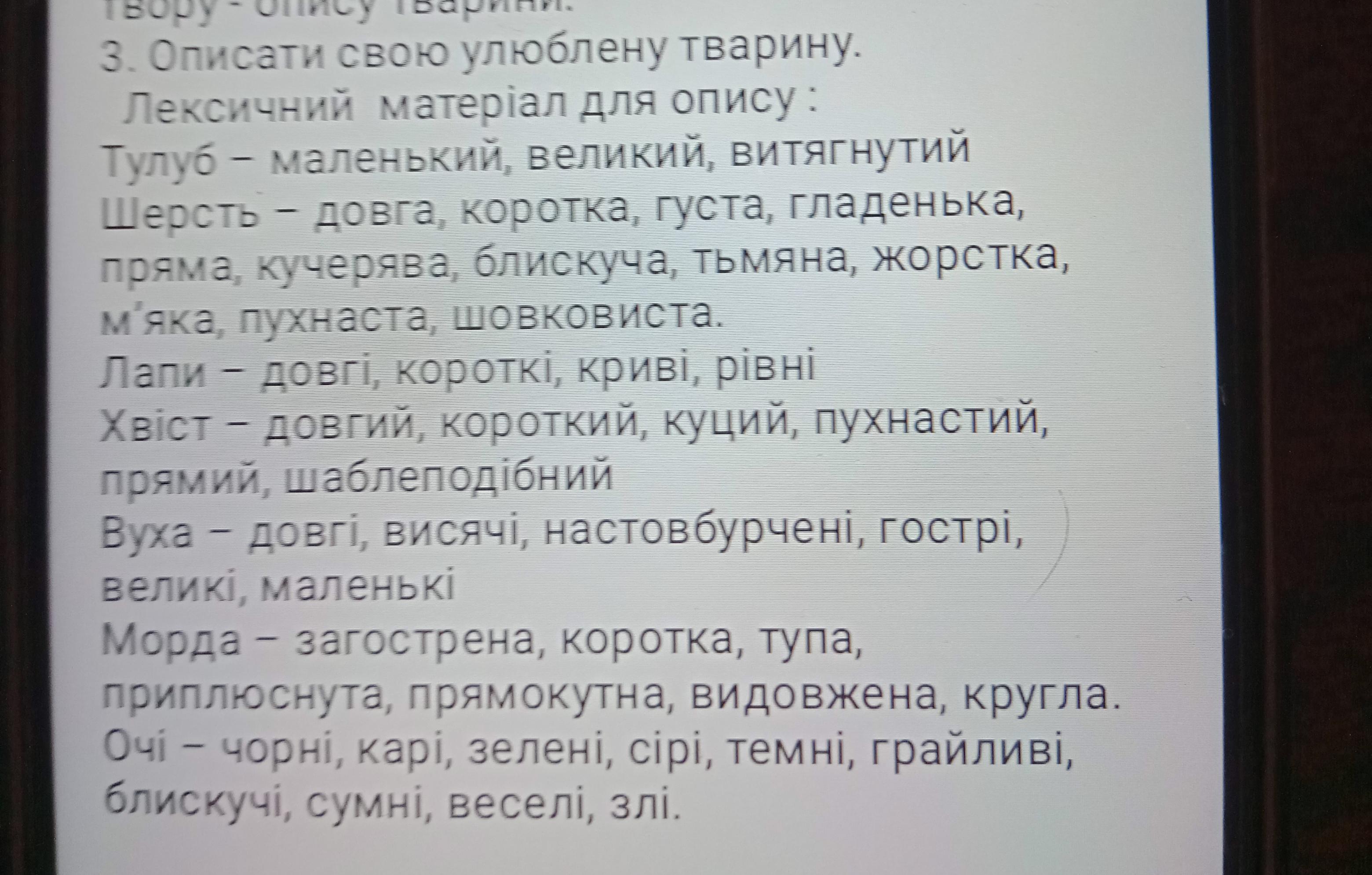 В мене є мій улюблений кіт. В нього дуже маленький тулуб, а шерсть в нього дуже гладенька та м'яка, блискуча, кольору сіро-білого, та лапки довгі, великі та масивні але теж м'якенькі, хвіст в нього короткий, пухнастий, але вуха не такі, вони довгі, великі та гострі, мов меч, а мордочка в нього загострена та трохи видовжена, а очі мов ніч, темні, блискучі та грайливі, але веселі.