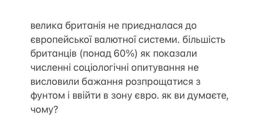 Більшість британців вважає, що Євросоюз встановлює надмірну стандартизацію.У британці вірять, що Брюселль диктує членам ЄС стандарти, які мають бути.У британців досить скептичне ставлення до Євросоюзу.А також вони переймаються щодо збереження фунта, як національної валюти та фінансової незалежності.