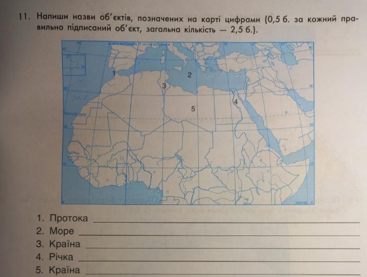 11. Напиши назви об'єктів, позначених на карті цифрами (0,56. за кожний пра- вильно підписаний об'єкт, загальна кількість - 2,5 6.).