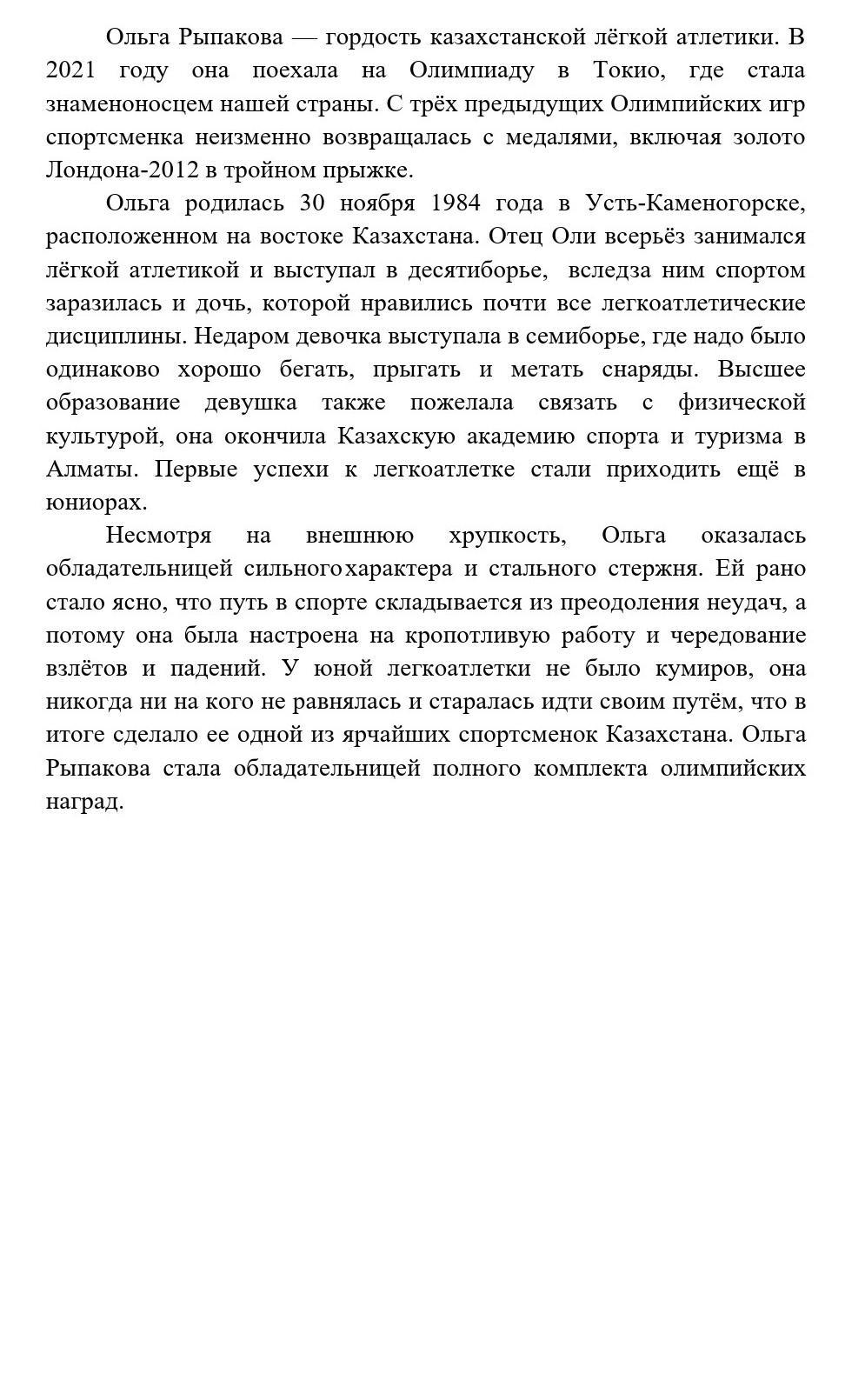 Основ.мысль текста - выдающийся человек, который опирался только на свой опыт и мнение. несмотря на трудности шел вперед и преодолевал их. благодаря своим заслугам, упорству спортсменка и стала гордостью лёгкой атлетики и чемпионкой Казахстана.