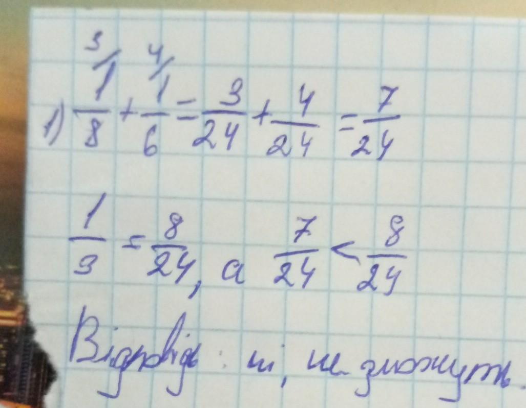 Перший автомат може розфасувати борошно за 8 хв, а другий — за 6 хв. Чи зможуть автомати за 1 хв спільної роботи розфасувати більше третини борошна?