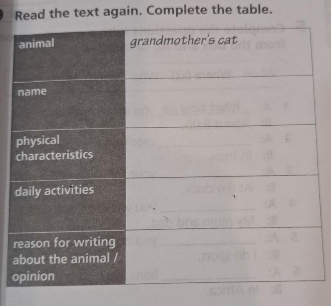 9 Read the text again. Complete the table. grandmother's cat animal name physical characteristics daily activities reason for writing about the animal / opinion
