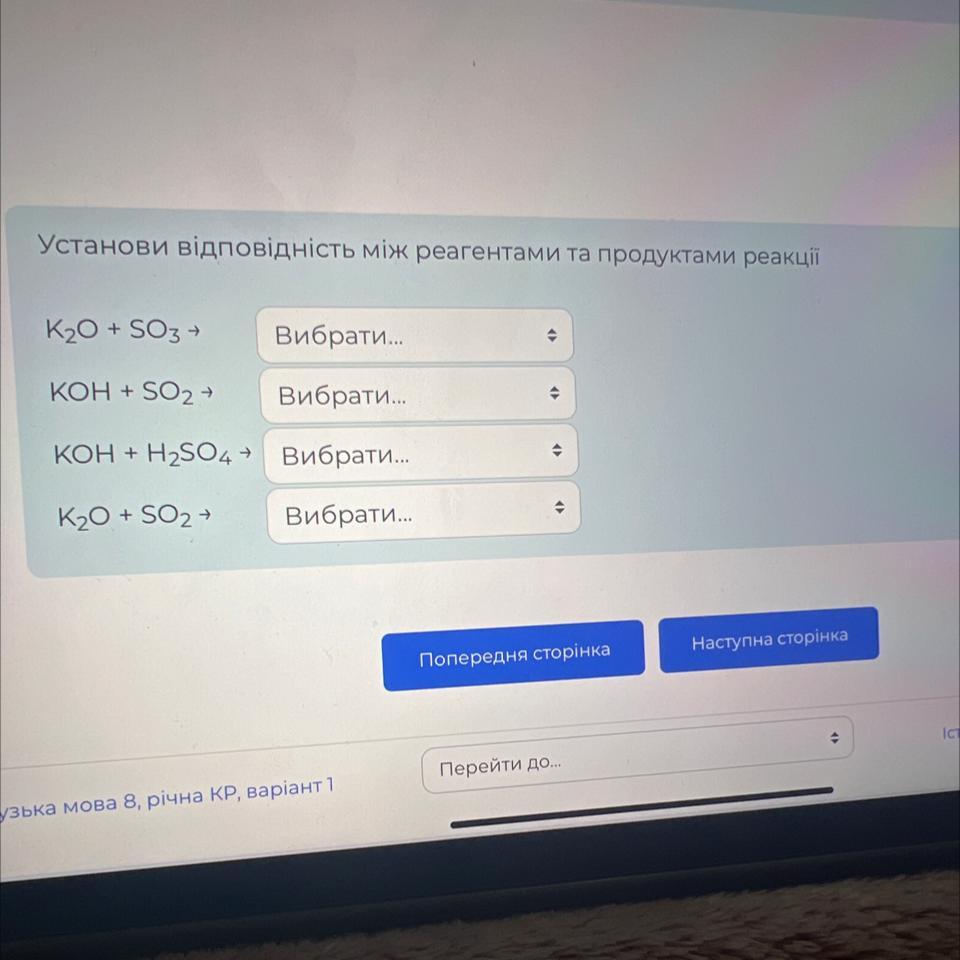 Установи відповідність між реагентами та продуктами реакції. K20 + 503→