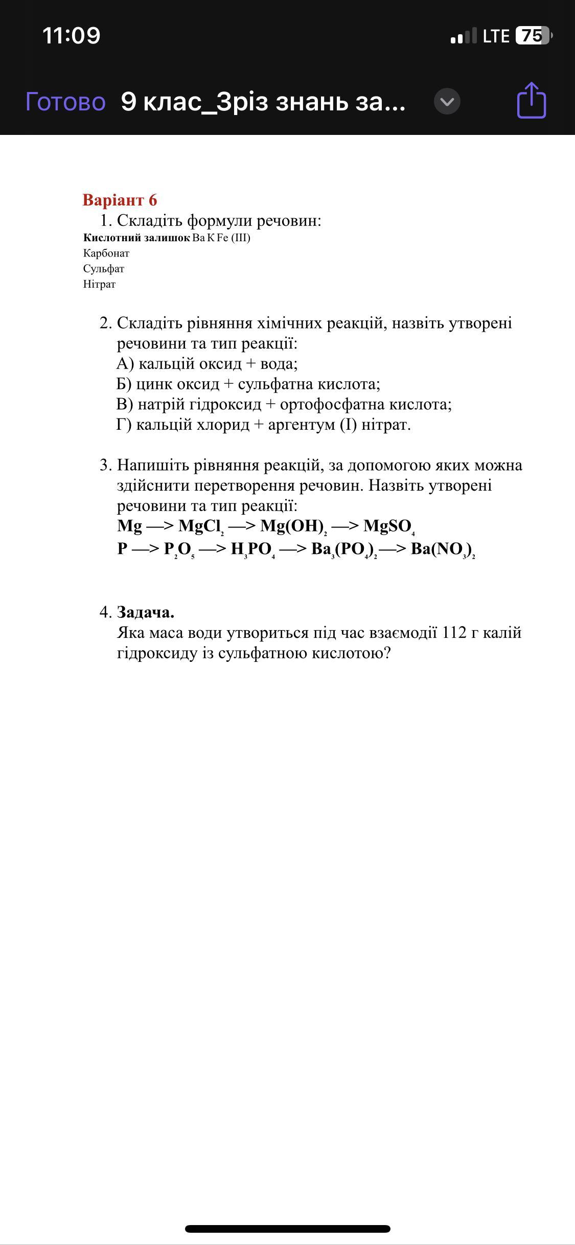 4. Задача. Яка маса води утвориться під час взаємодії 112 г калій гідроксиду із сульфатною