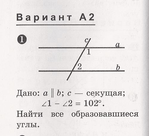 угол1 и угол2-это внутренние односторонние углы, их сумма=180, угол1+угол2=180, угол1-угол2=102, угол1=102+угол2, 102+угол2+угол2=180, 2*угол2=180-102=78, угол2=78/2=39, угол1=102+39=141, все тупые углы на рисунке=141, все острые=39