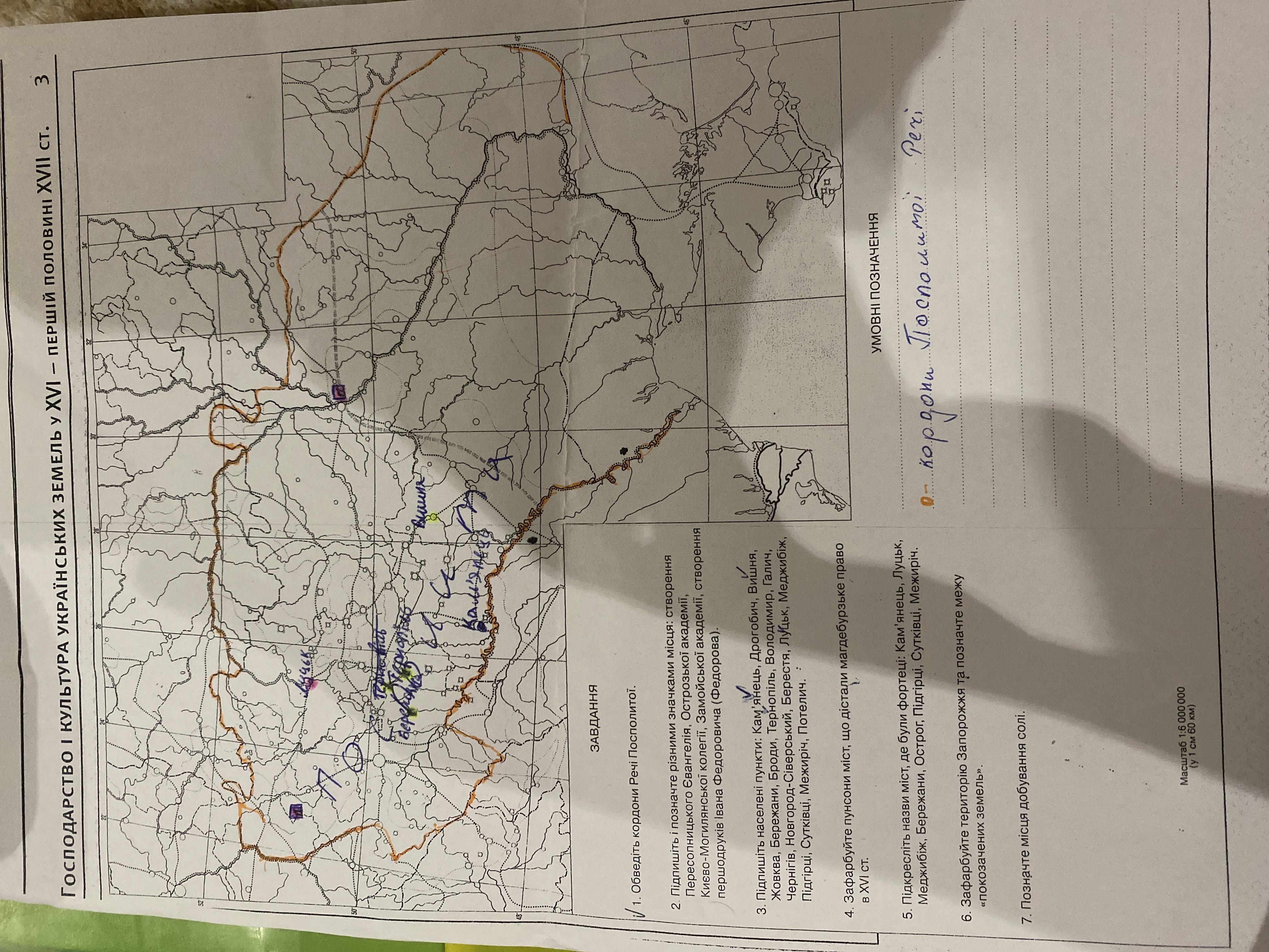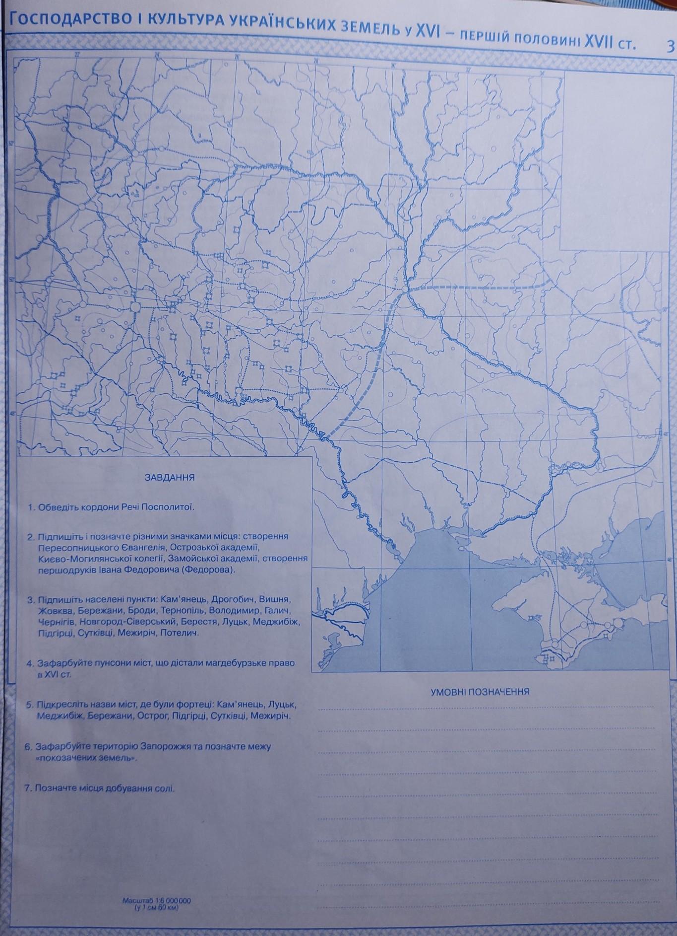 ЗАВДАННЯ 1. Обведіть кордони Речі Посполитої. 2. Підпишіть і позначте різними значками місця: створення Пересопницького Євангелія, Острозької академії, Киево-Могилянської колегії, Замойської академії, створення першодруків Івана Федоровича (Федорова). 3. Підпишіть населені пункти: Кам'янець, Дрогобич, Вишня, Жовква, Бережани, Броди, Тернопіль, Володимир, Галич, Чернiгiв, Новгород-Сіверський, Берестя, Луцьк, Меджибіж, Підгірці, Сутківці, Межиріч, Потелич. 4. Зафарбуйте пунсони міст, що дістали магдебурзьке право в XVI ст. 5. Підкресліть назви міст, де були фортеці: Кам'янець, Луцьк, Меджибіж, Бережани, Острог, Підгірці, Сутківці, Межиріч. 6. Зафарбуйте територію Запорожжя та позначте межу «покозачених земель. 7. Позначте мiсця добування солі.
