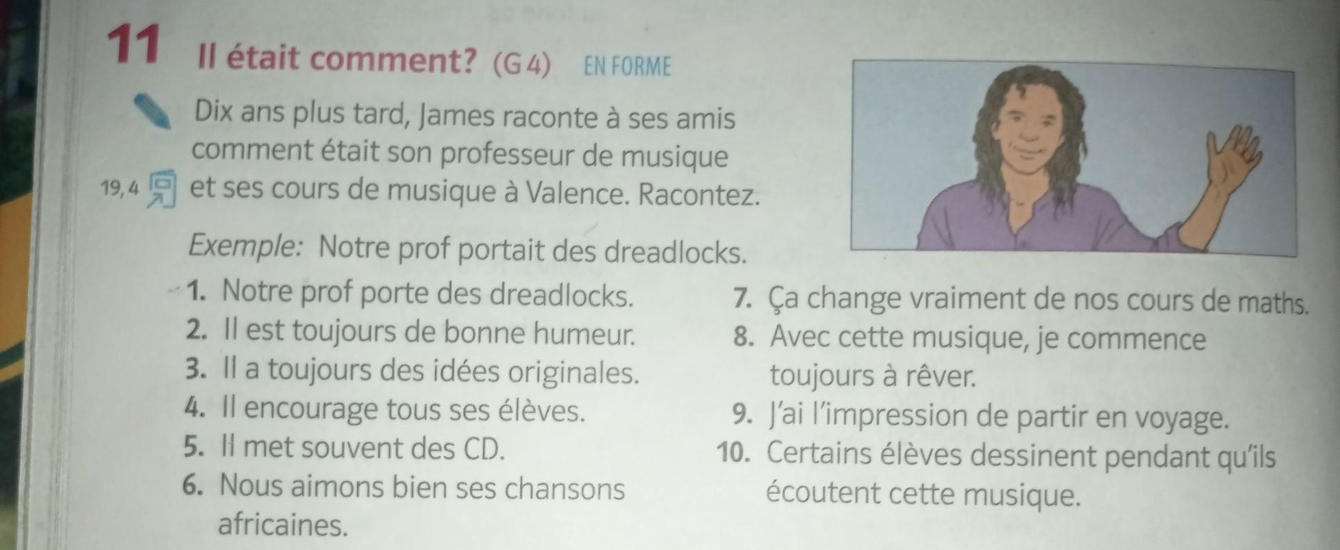 Exemple: Notre prof portait des dreadlocks. 1. Notre prof porte des dreadlocks. 2. Il est toujours de bonne humeur. 3. Il a toujours des idées originales. 4. Il encourage tous ses élèves. 5. Il met souvent des CD. 6. Nous aimons bien ses chansons africaines. 7. Ça change vraiment de nos cours de maths. 8. Avec cette musique, je commence toujours à rêver. 9. J'ai l'impression de partir en voyage. 10. Certains élèves dessinent pendant qu'ils écoutent cette musique. помогите!!!!!!!!!