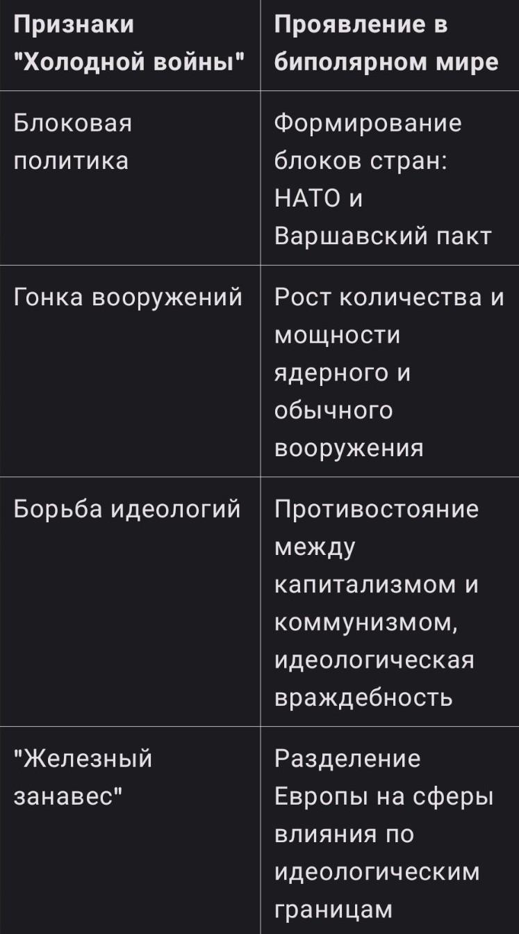Эти признаки сформировали уникальную геополитическую обстановку, которая оказала влияние на мировую историю и структуру международных отношений в течение десятилетий.