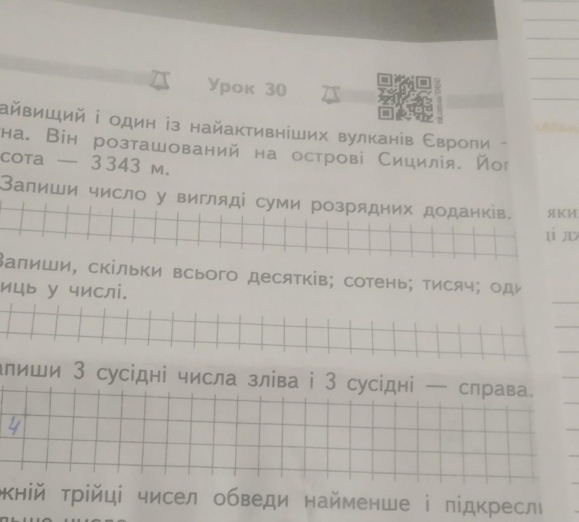 7 Урок 30 д 1. Найвищий і один із найактивніших вулканів Європи Етна. Він розташований на острові Сицилія. Йог - 3 343 м. висота - • Запиши число у вигляді суми розрядних доданків. mk.com.ua/104541 Запиши, скільки всього десятків; сотень; тисяч; оди ниць у числі. завдання З ЯКИХ Д ці джер