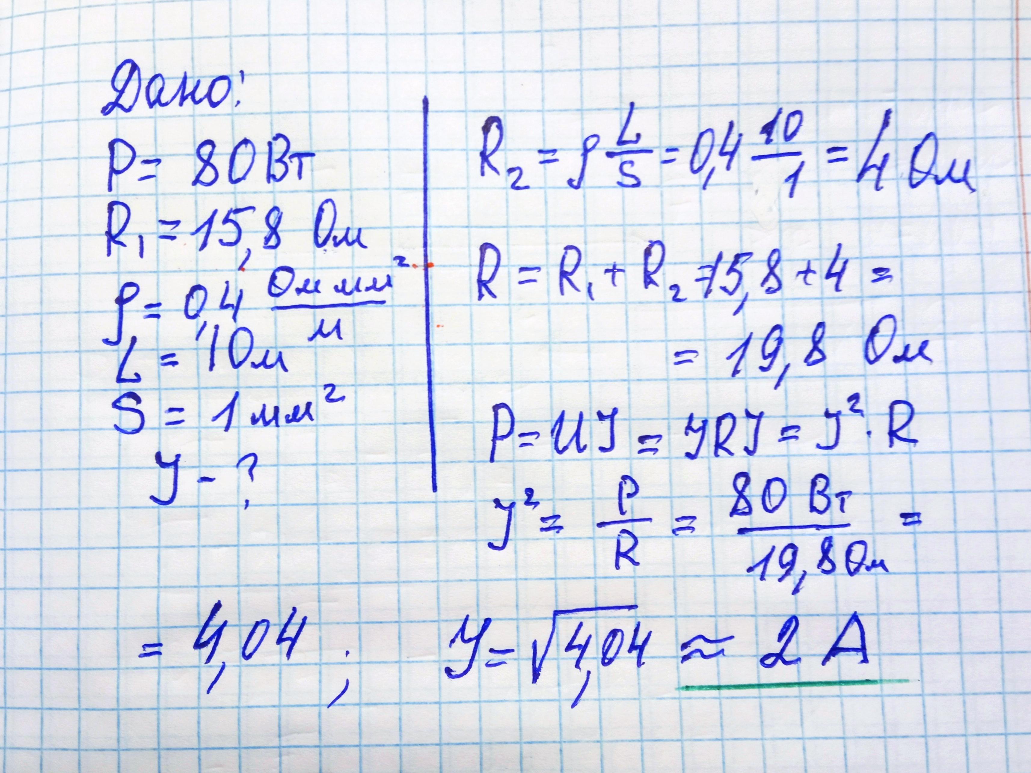 Теплова потужність ділянки пола, що скоюється з двох послідовно з'єднаних провід дорівнює 80 Вт. Визначте загальну силу струму в ділянці, якщо відомо, що один із провідників має опір 15,8 Ом, в другий являє собою нікеліновий провід завдовжки 10 м і перерізом 1,0 мм².