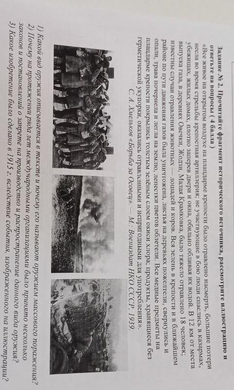 Задание № 2. Прочитайте фрагмент исторического источника, рассмотрите иллюстрацию и ответьте на вопросы (4 балла) Все живое на открытом воздухе на плацдарме крепости было отравлено насмерть, большие потери несла во время стрельбы крепостная артиллерия, не участвующие в бою люди спаслись в казармах, убежищах, жилых домах, плотно заперев двери и окна, обильно обливая их водой. В 12 км от места выпуска газа, в деревнях Овечки, Жодзи, Малая Крамковка, было тяжело отравлено 18 человек; известны случаи отравления животных лошадей и коров. Вся зелень в крепости ближайшем районе по пути движения газов была уничтожена, листья на деревьях пожелтели, свернулись и опали, трава почерпела и легла на землю, лепестки цветов облетели. Все медные предметы на плацдарме крепости покрылись толстым зелёным слоем окиси хлора, продукты, хранящиеся без герметической укупорки, оказались отравленными и непригодными для употребления» С. А. Хмельков «Борьба за Осовец» М.: Воениздат НКО СССР, 1939. 1) Какой вид оружия описывается в тексте и почему его называют оружием массового поражения? 2) Почему на протяжении ряда лет международными организациями было принято несколько законов и постановлений о запрете на производство и распространение данного вида оружия? 3) Какое изобретение было сделано в 1915 г. вследствие события, изображенного на иллюстрации? СРОЧНО ПОЖАЛУЙСТА ДАЮ 40 БАЛЛОВ