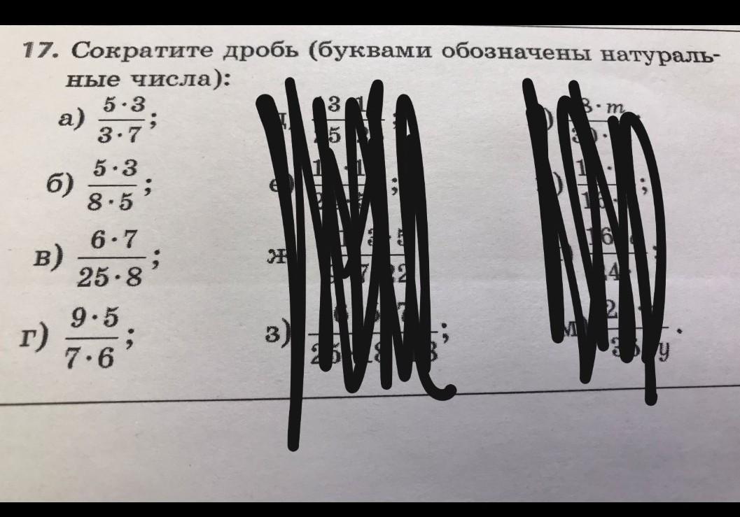 17. Сократите дробь (буквами обозначены натураль- ные числа): 5.3 a) ; 3.7 5.3 ; 8.5 6-7 25.8 6) B) г) 9.5 7.6 ; ; Ж 3) л m