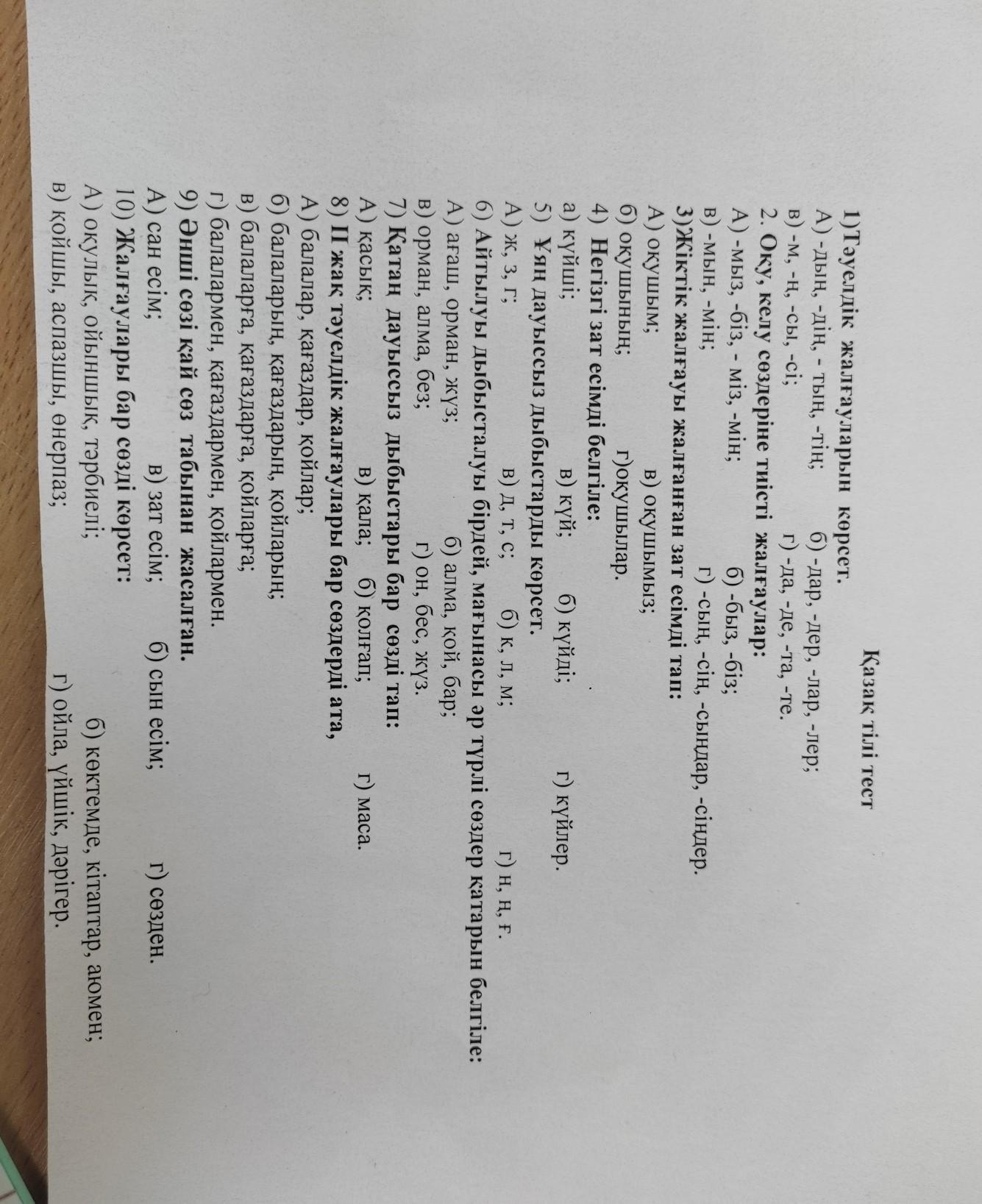 Қазақ тілі тест 1)Тәуелдік жалғауларын А) -дың, -дің, - тың, -тің; в) -м, -ң, -сы, -сi; көрсет. б) -дар, -дер, -лар, -лер; г) -да, -де, -та, -те. иісті жалғаулар:
