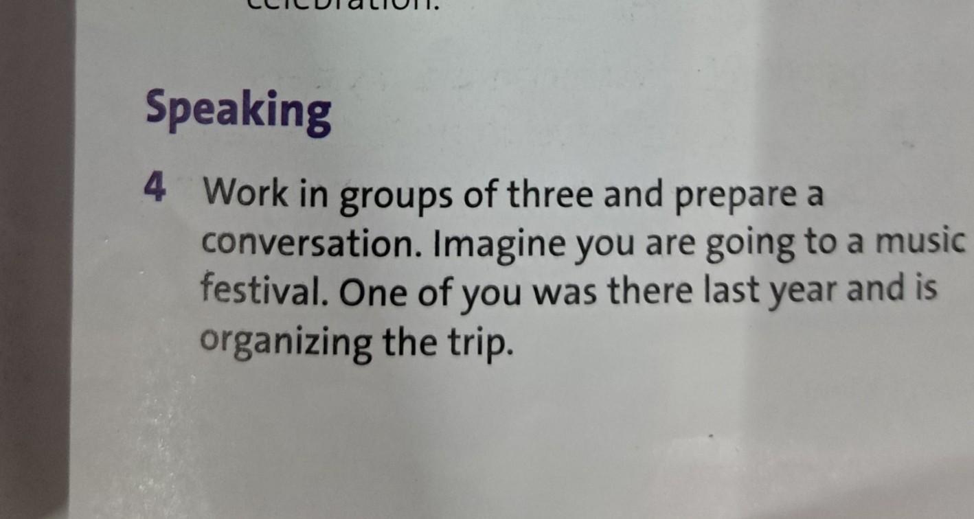 4 Work in groups of three and prepare a conversation. Imagine you are going to a music festival. One of you was there last year and is organizing the trip.