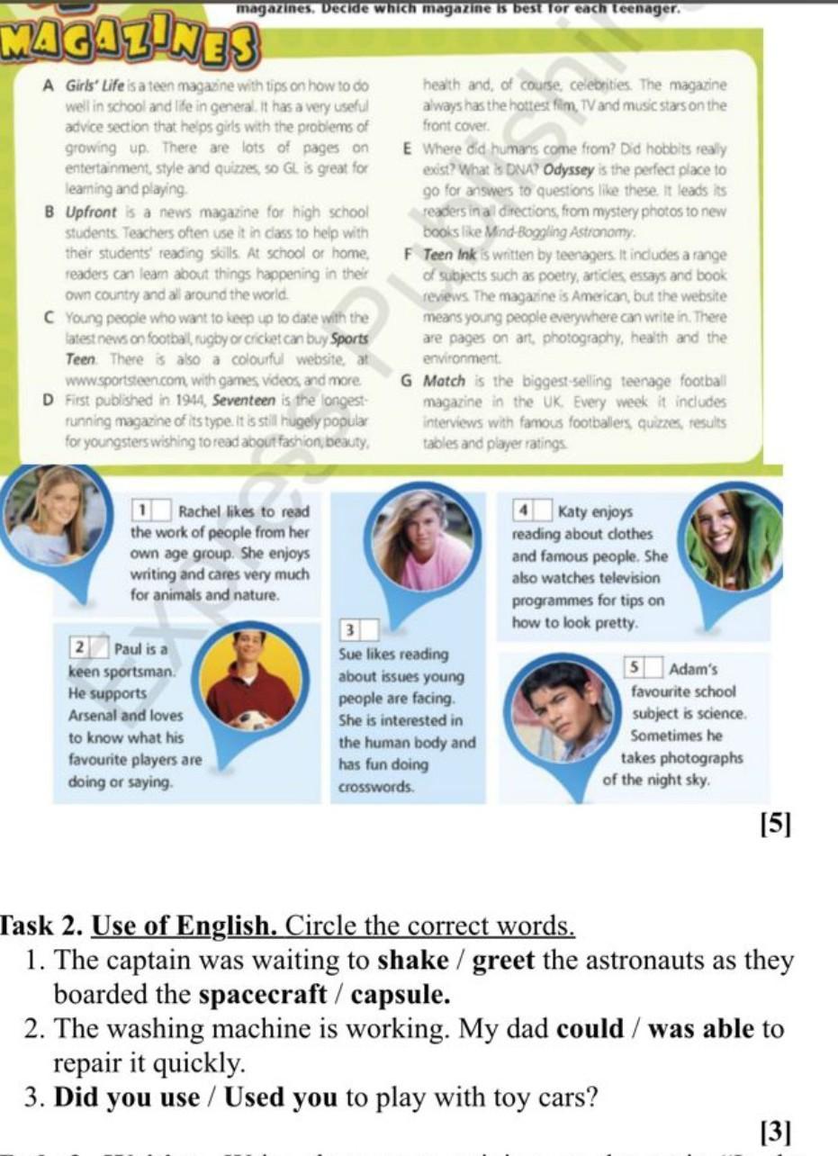 Task 2. Use of English. Circle the correct words. 1. The captain was waiting to shake / greet the astronauts as they boarded the spacecraft / capsule. 2. The washing machine is working. My dad could / was able to repair it quickly. 3. Did you use / Used you to play with toy cars? [3]