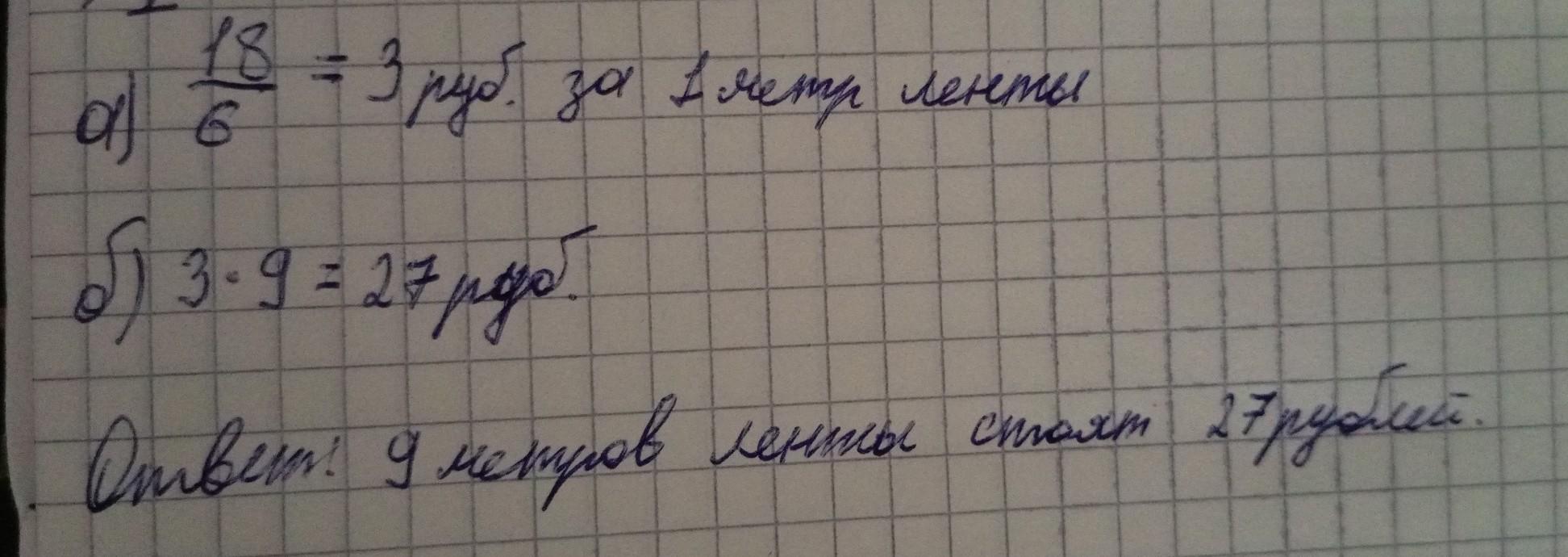 математика третий класс страница сорок второй задача второй за 6 м Лента заплатила 18 руб сколько рублей стоит 9 м такой ленты