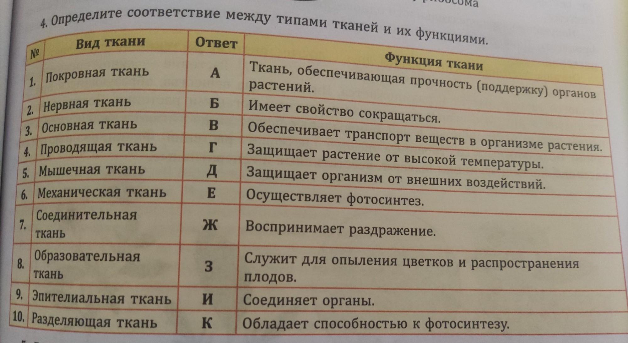 4. Определите соответствие между типами тканей и их функциями. Вид ткани Функция ткани 1. Покровная ткань Ткань, обеспечивающая прочность (поддержку) органов растений. 2. Нервная ткань Имеет свойство сокращаться. 3. Основная ткань Я 4. Проводящая ткань 5. Мышечная ткань 6. Механическая ткань Соединительная Образовательная 3 9. Эпителиальная ткань И Соединяет органы. 10. Разделяющая ткань К Обладает способностью к фотосинтезу. ткань Ответ A Б В r ткань Обеспечивает транспорт веществ в организме растения. Защищает растение от высокой температуры. Защищает организм от внешних воздействий. Осуществляет фотосинтез. Д E Ж Воспринимает раздражение. Служит для опыления цветков и распространения плодов.