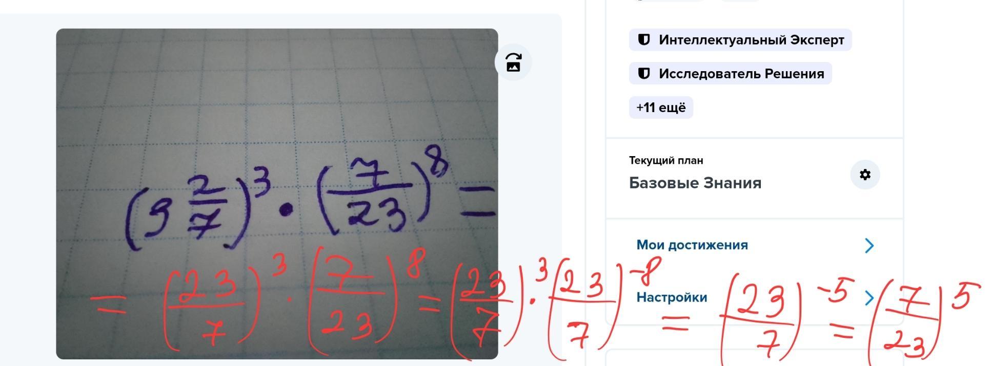Срочноооо даю 30 балов Обчисліть використуючі властивості степеня з натуральним показником (3²/7)³*(⁷/23)⁸=