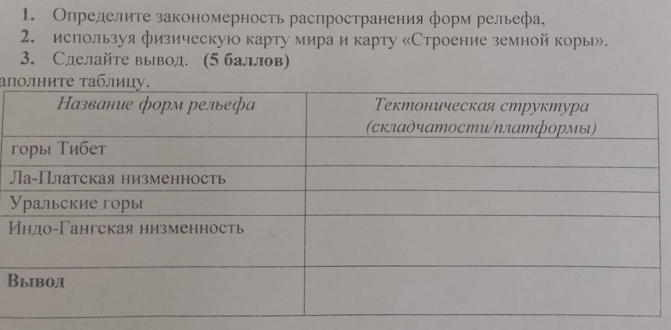 1. Определите закономерность распространения форм рельефа, 2. используя физическую карту мира и карту «Строение земной коры». 3. Сделайте вывод. (5 баллов) Заполните таблицу. Название форм рельефа горы Тибет Ла-Платская низменность Уральские горы Индо-Гангская низменность Вывод Тектоническая структура (складчатости/платформы)