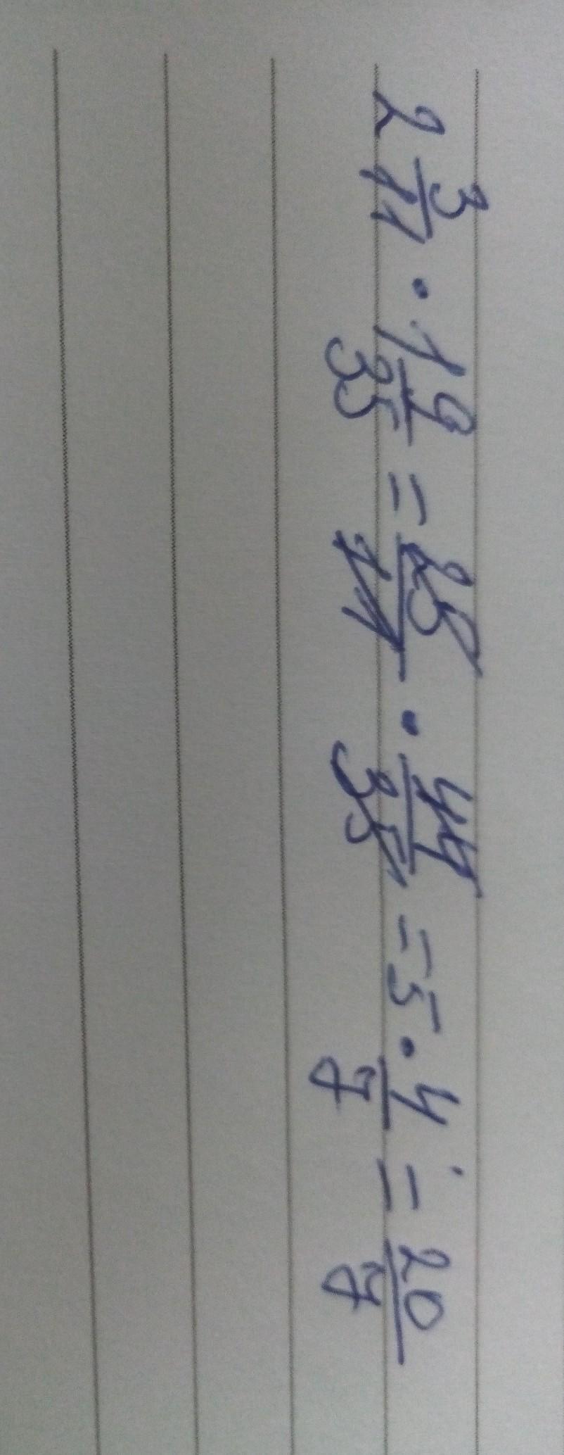 2 3/11×1 9/35=25/11×44/35(скорочуємо 11,та 44)=25×4/11(потім скорочуємо з того самого друбу якого ми скорочили треба скоротити 25,та 35)=5× 4/7=20/7