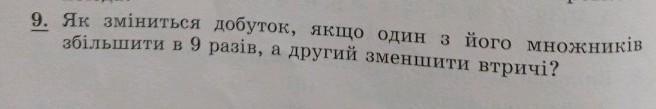 9. Як зміниться добуток, якщо один з його множників збільшити в 9 разів, а другий зменшити втричі? очни строчно нужно