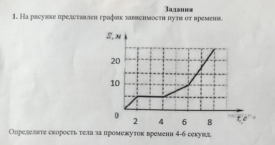 1. На рисунке представлен график зависимости пути от времени. S, X 20 10 0 2 4 6 8 Определите скорость тела за промежуток времени 4-6 секунд.