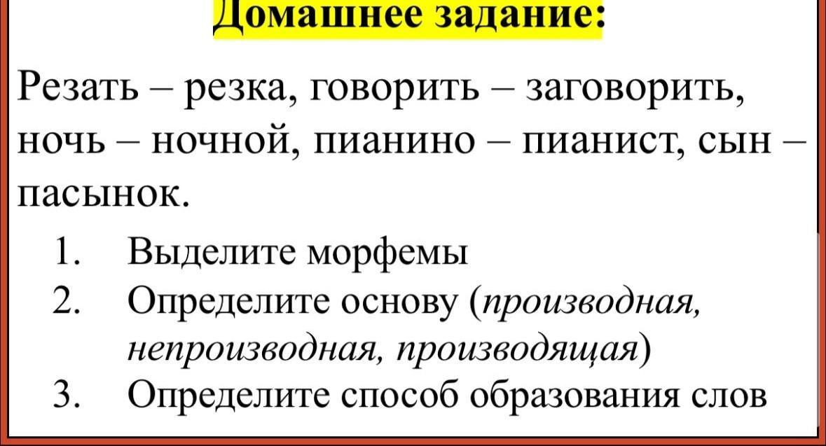 Домашнее задание: Резать – резка, говорить - заговорить, ночь - ночной, пианино - пианист, сын пасынок. 1. Выделите морфемы 2. Определите основу (производная, непроизводная, производящая) 3. Определите способ образования слов - пожалуйста ответьте