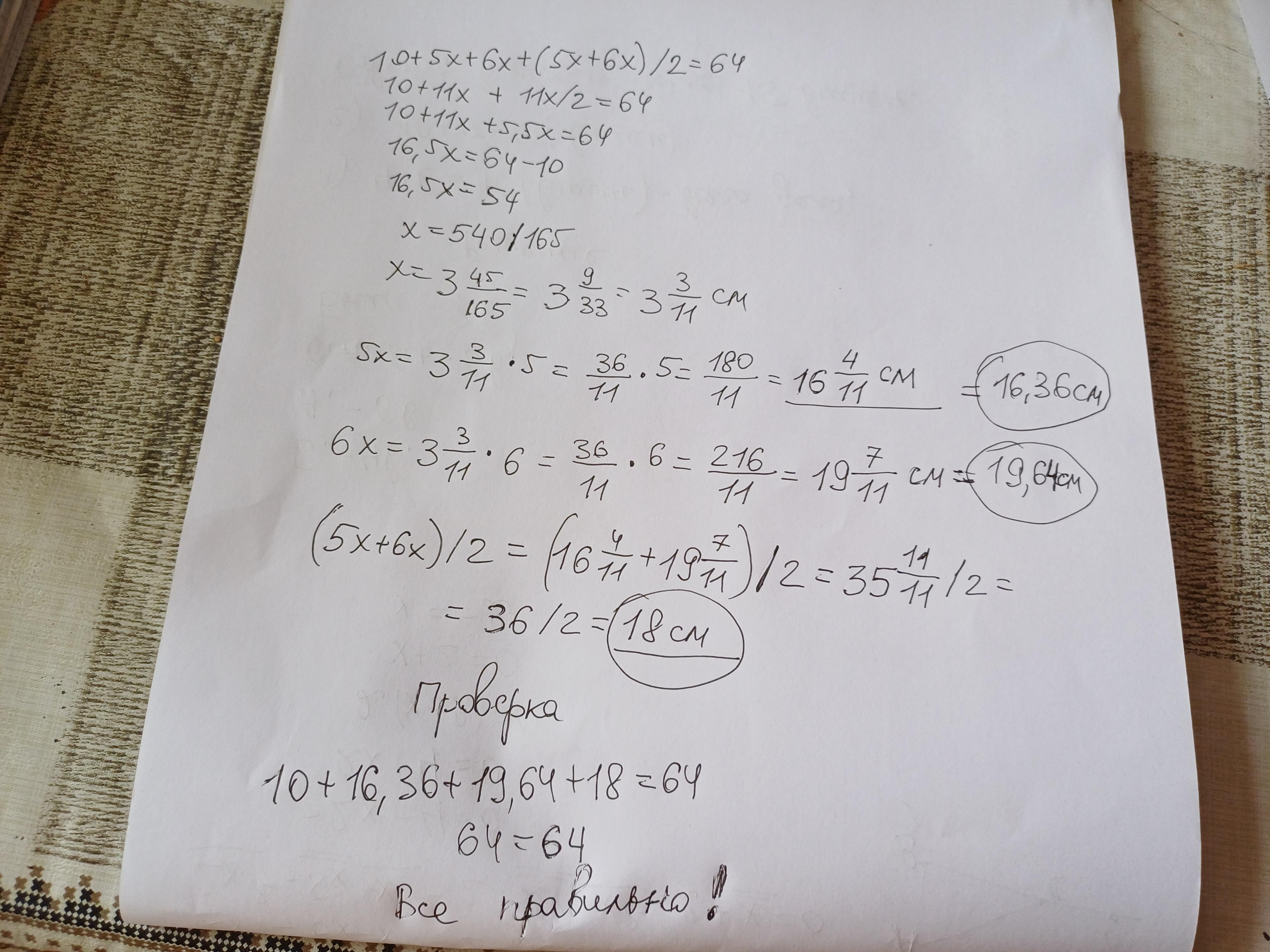 Знайдіть невідомі сторони чотирикутника, периметр якого дорівнює 64 см одна зі сторін 10 см , друга та третя відносятся як 5 : 6, а четверта дорівнює піврізниці другої та третьої