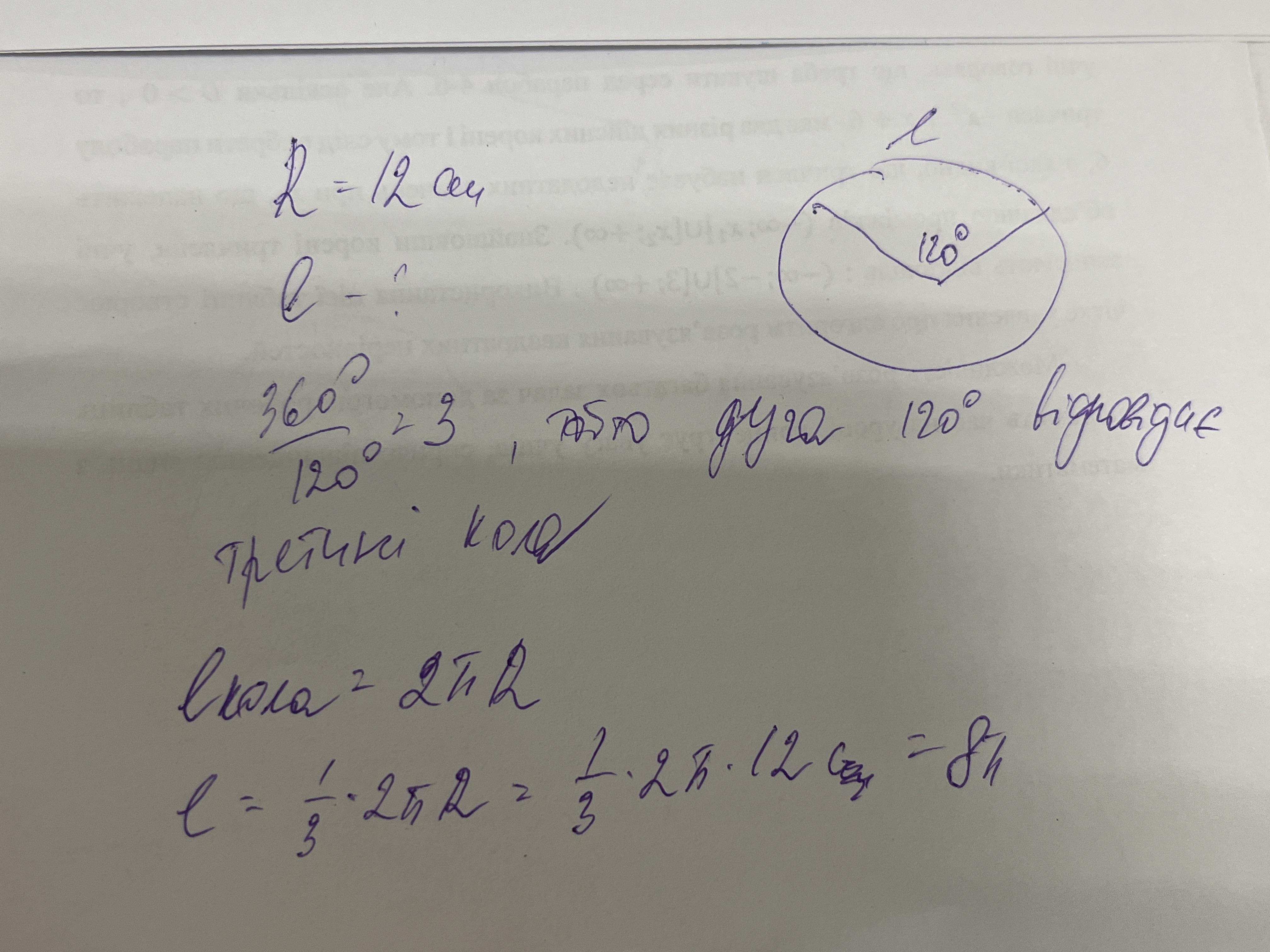 Радіус кола дорівнює 12 см. Знайти довжину кола, яка відповідає центральному куту 120*