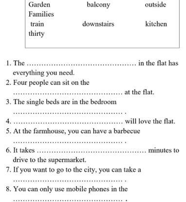 Garden train kitchen balcony Families 1. The 2. Four people can sit on the ...... 3........ outside thirty 4. It takes ..... 5. You can only use mobile phones in the.. downstairs in the flat has everything you need. ...... at the flat. . will love the flat. ...... minutes to drive to the supermarket.