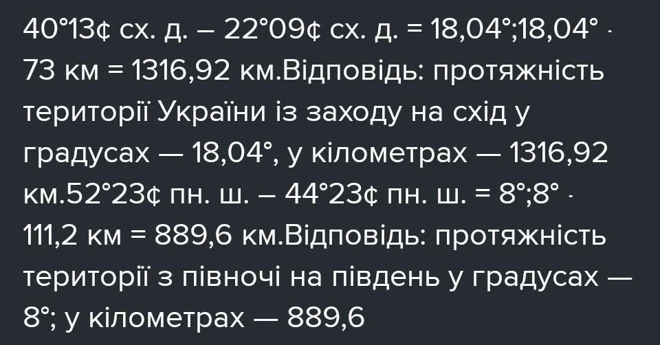Визначте протяжність території України в градусах і кілометрах: