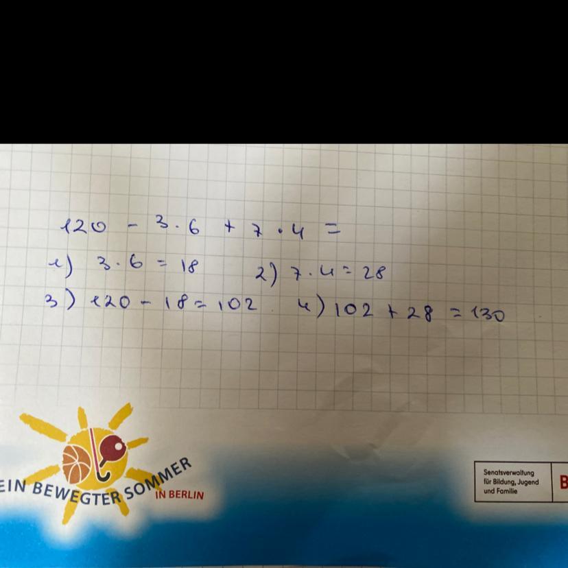 120 - 3 • 6 + 7 • 4 = 120 - 18 + 28 = 130