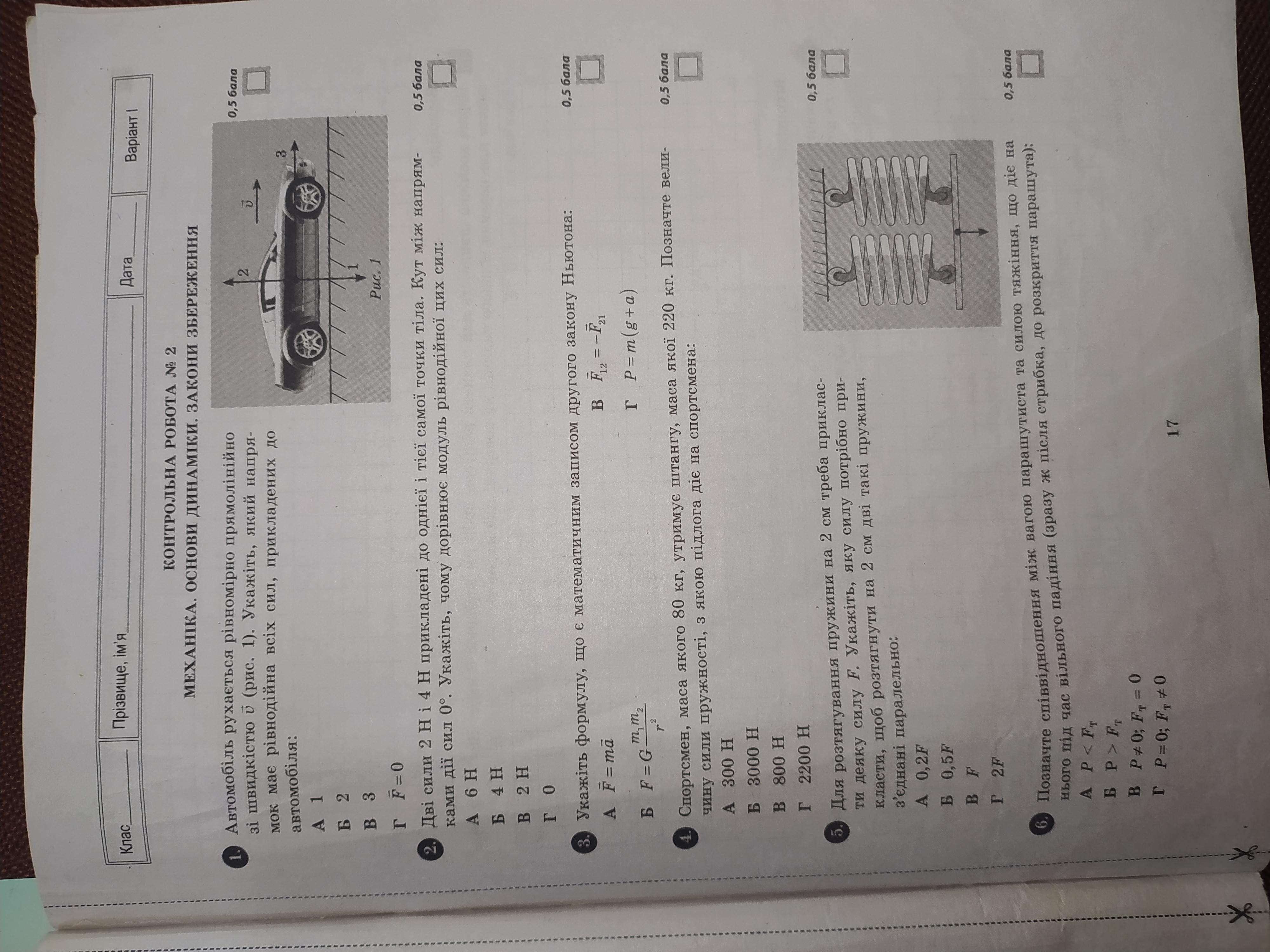 Автомобіль рухається рівномірно прямолінійно зі швидкістю v ( рис. 1). Укажіть, який напрямок має рівнодійна всіх сил, прикладених до автомобіля: