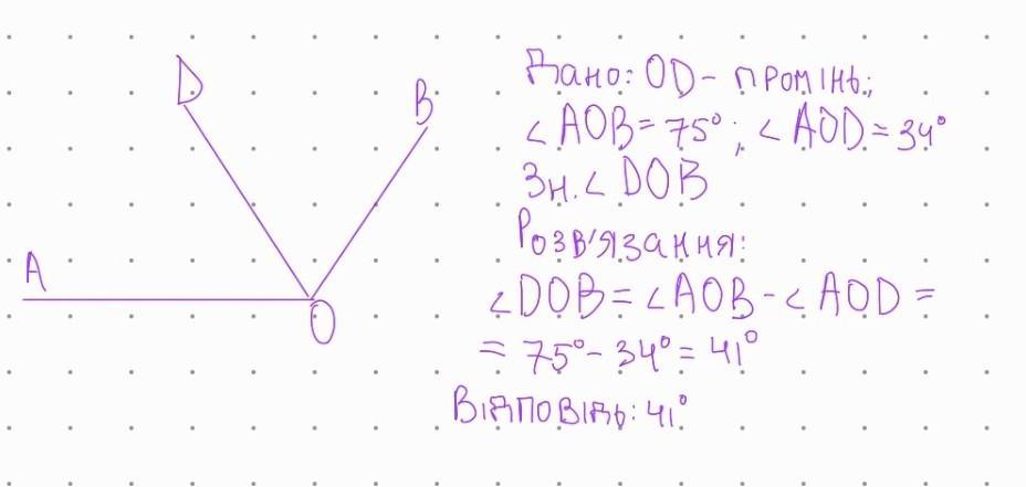 Промінь OD проходить між сторонами кута АОВ. Знайдіть величину кута DOB, якщо AOB = 75°, AOD=34°