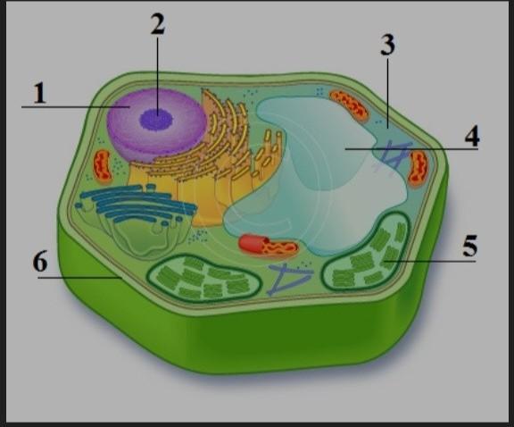 4-вакуоля 2-ядрице 1-ядерна оболонка 6-клітинна мембрана 5-хлоропласти 3-цитоплазма